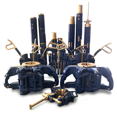 Premium Pipe Rentals' safety clamps are designed with flexibly hinged links with tapered slips that securely grip the pipe or collar. The taped mounting offers protection against pipe slippage by wedging against the surface if the pipe shifts. Safety clamps come in a variety of sizes.